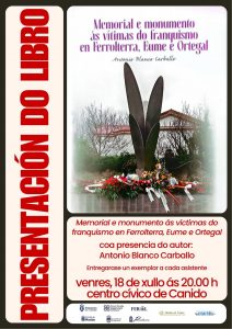 « Todos los Eventos Este evento ha pasado. Presentacion do libro: MEMORIAL E MONUMENTO DAS VÍTIMAS DO FRANQUISMO EN FERROLTERRA, EUME E ORTEGAL julio 18 @ 20:00 - 21:00 « PALESTRA. A RÍA DE FERROL con Guillermo Díaz Agras (xefe da Estación Biolóxica de A Graña) EXPOSICIÓN DO ALUMNADO DE SOFÍA PIÑEIRO » + Google Calendar+ Exportación de iCal Detalles Fecha: julio 18 Hora: 20:00 - 21:00 Organizador Muiño do Vento Teléfono: 695 533 984 Correo electrónico: canido@muinhodovento.gal Web: https://muinhodovento.gal Local ASC MUIÑO DO VENTO Rúa Poeta Pérez Parallé S/N ferrol, A Coruña 15401 España + Google Map Web: https://muinhodovento.gal/