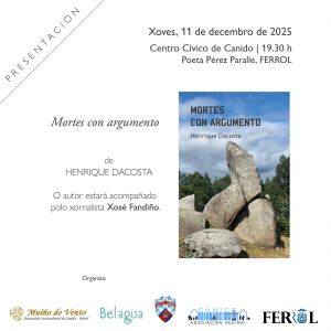 « Todos los Eventos Este evento ha pasado. Presentación do libro Mortes con argumento de HENRIQUE DACOSTA 11 diciembre, 2025 @ 19:30 - 20:30 « RADIO: Unha tarde no Muíño RADIO: Unha tarde no Muíño » + Google Calendar+ Exportación de iCal Detalles Fecha: 11 diciembre, 2025 Hora: 19:30 - 20:30 Organizador Muiño do Vento Teléfono: 695 533 984 Correo electrónico: canido@muinhodovento.gal Web: https://muinhodovento.gal Local ASC MUIÑO DO VENTO Rúa Poeta Pérez Parallé S/N ferrol, A Coruña 15401 España + Google Map Web: https://muinhodovento.gal/